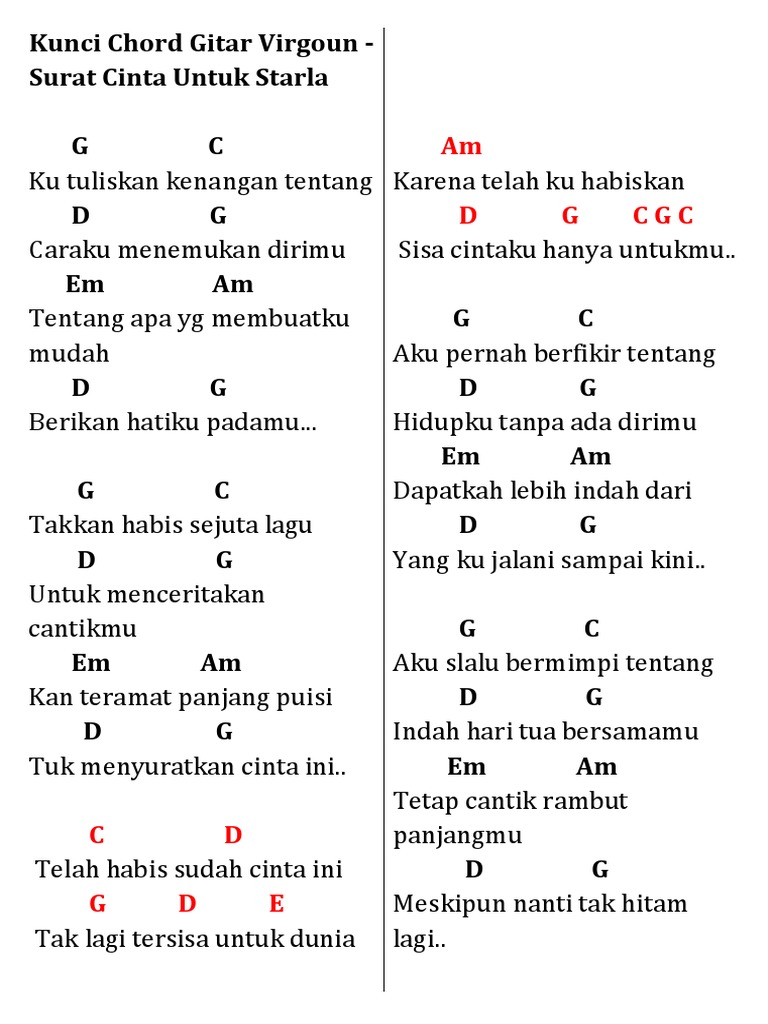 G c aku pernah berfikir tentang d g hidupku tanpa ada dirimu em am dapatkah lebih indah dari d g yang ku jalani sampai kini g c aku slalu bermimpi tentang d g indah hari tua bersamamu em am tetap cantik rambut panjangmu d g meskipun nanti tak hitam lagi chorus. D E Dan tlah habis sudah cinta ini A E F Tak lagi tersisa untuk dunia Bm. Virgoun - Surat Cinta Untuk Starla.